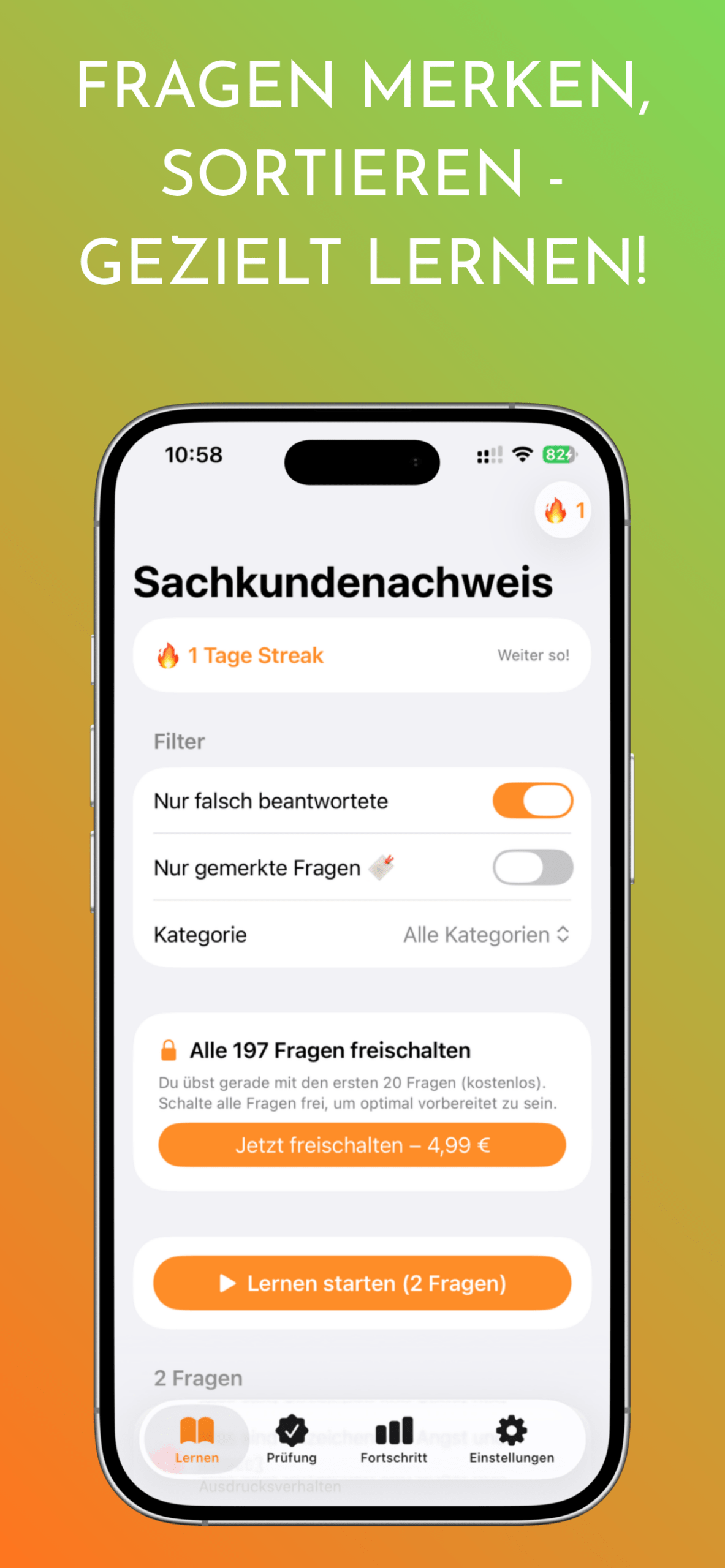 Lernfragen, Erklärungen und Wissenstests – alles was du für den Sachkundenachweis brauchst, direkt in der App. Kostenlos starten, Vollversion freischalten.